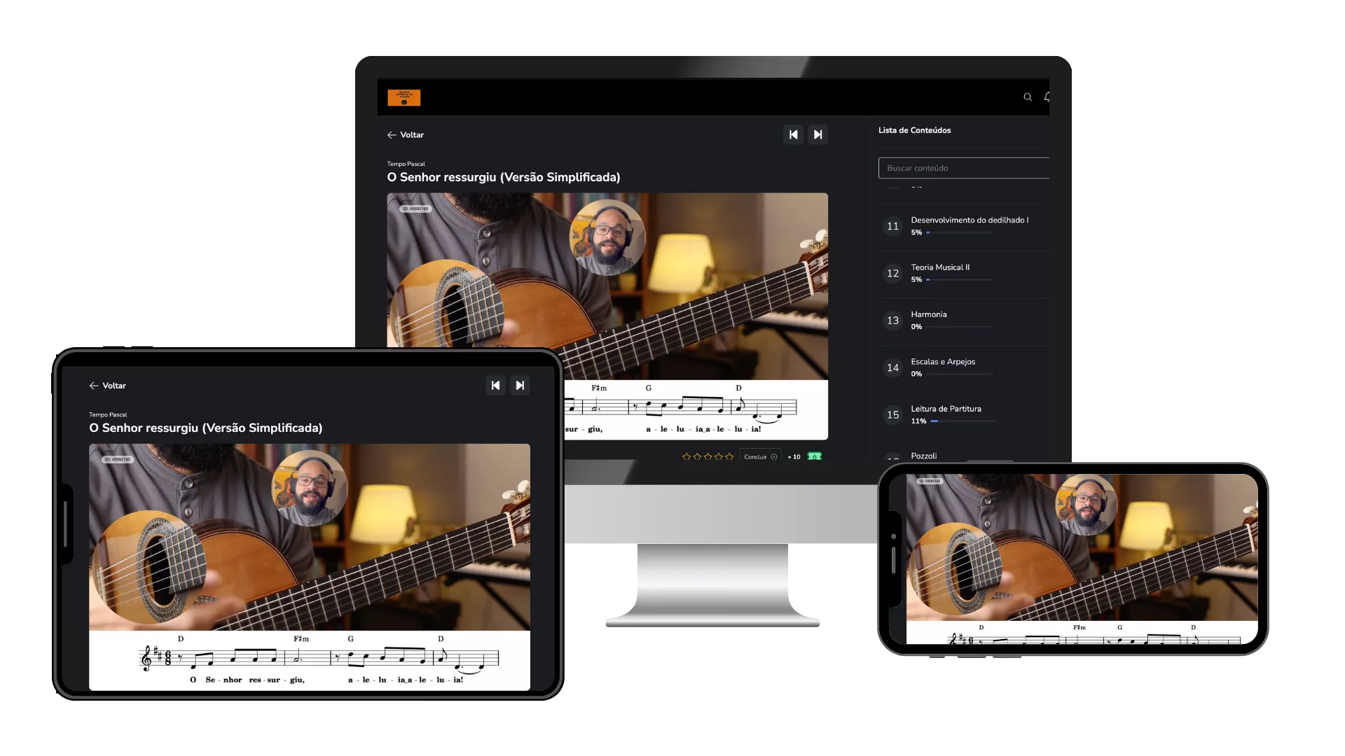 Aprender violão nunca foi tão fácil! Na Escola Católica de Violão, você tem a liberdade de estudar 100% on-line, no seu ritmo e no conforto da sua casa. Seja no celular, computador ou tablet, as aulas estão sempre à sua disposição, onde e quando você quiser.